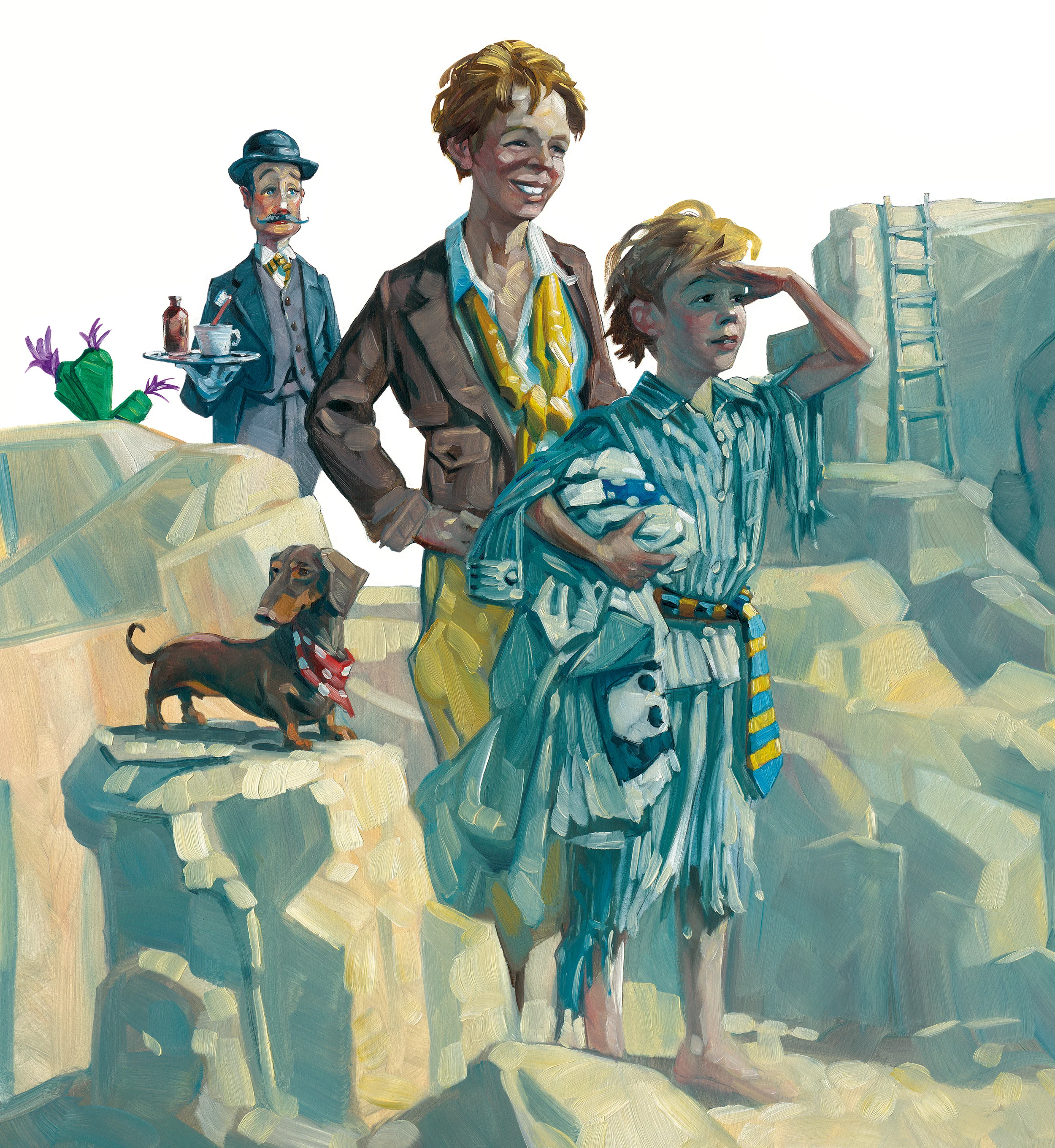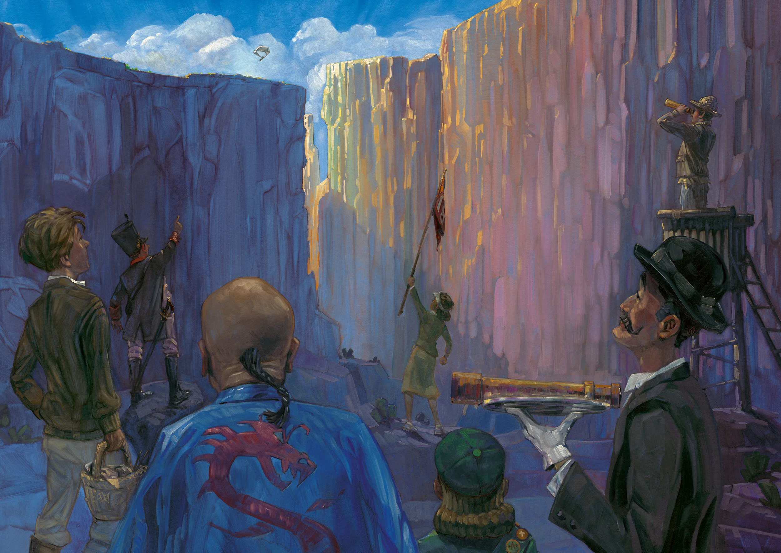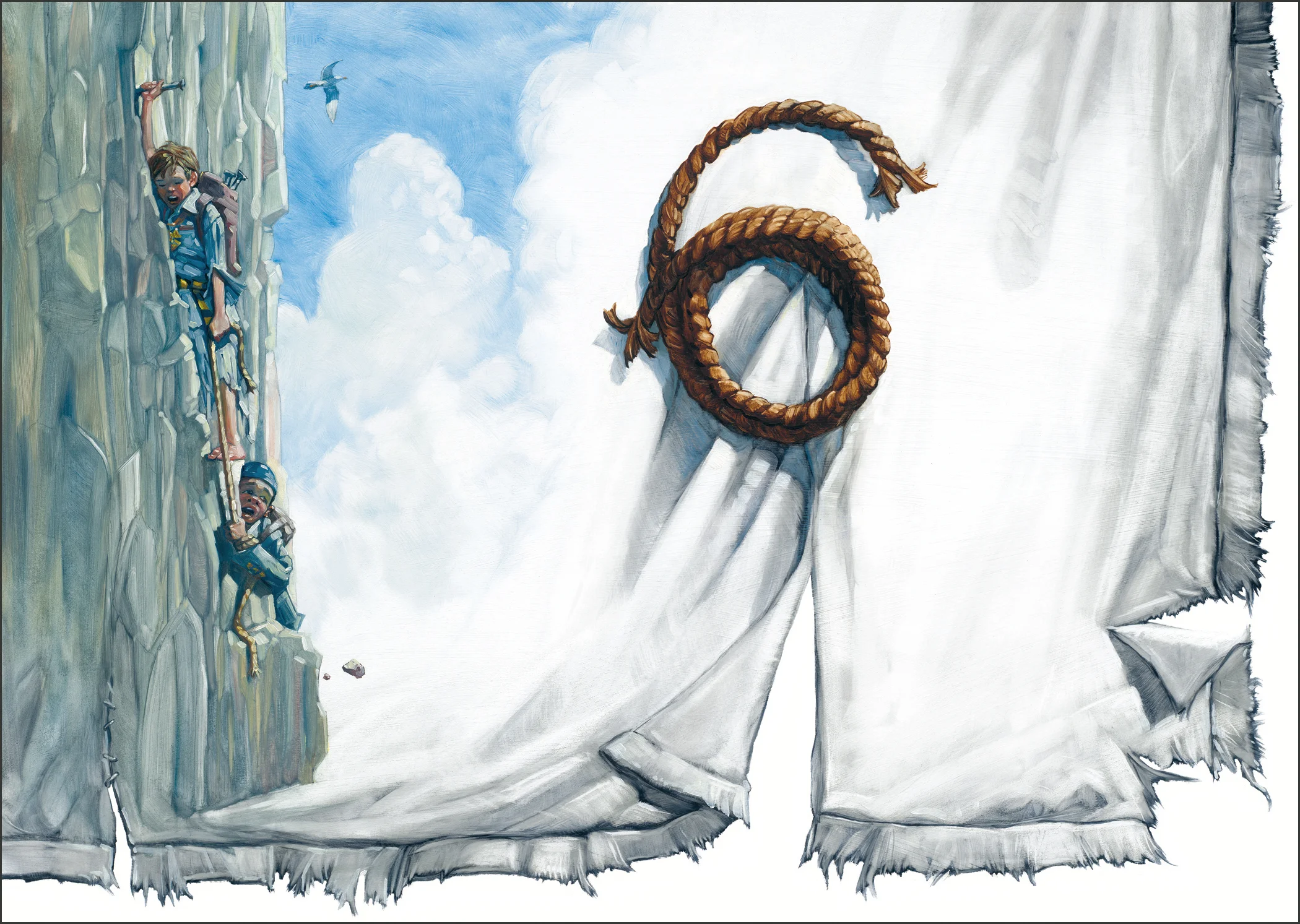 The Cliff Face • Oil on illustration board. Each chapter begins with a number that illustrates something from a pivotal scene. I also incorporated the bed sheet that Bartholomew use to fly away; throughout the book the sheet becomes tattered and adorned with souvenirs from his adventure.