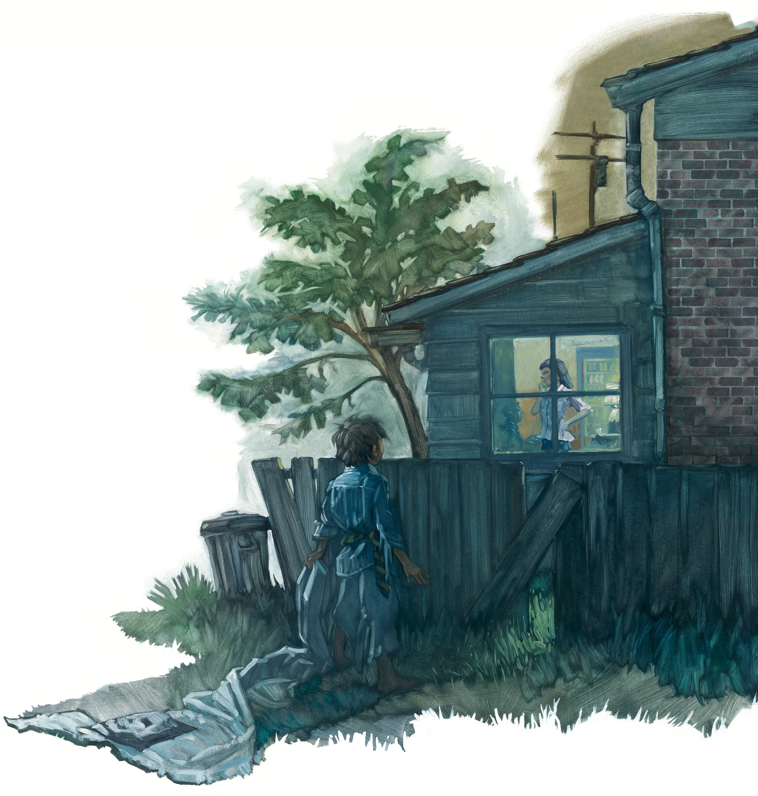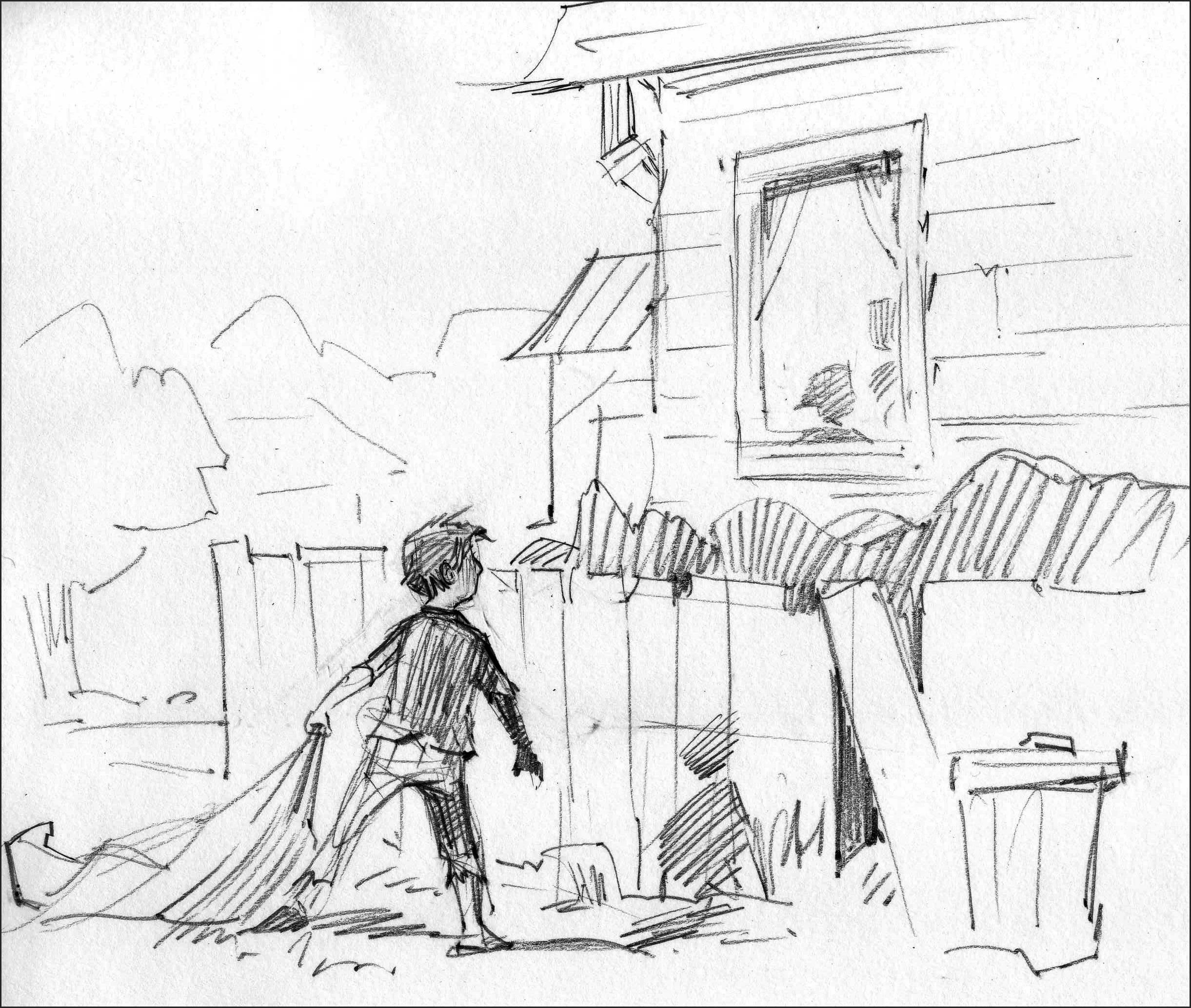 Sketch for Home Again. Rather than have the boy return to his home via the front door, I put him in the backyard, behind a fence, to illustrate the distance his adventure/growth has put between himself and the boy he was.