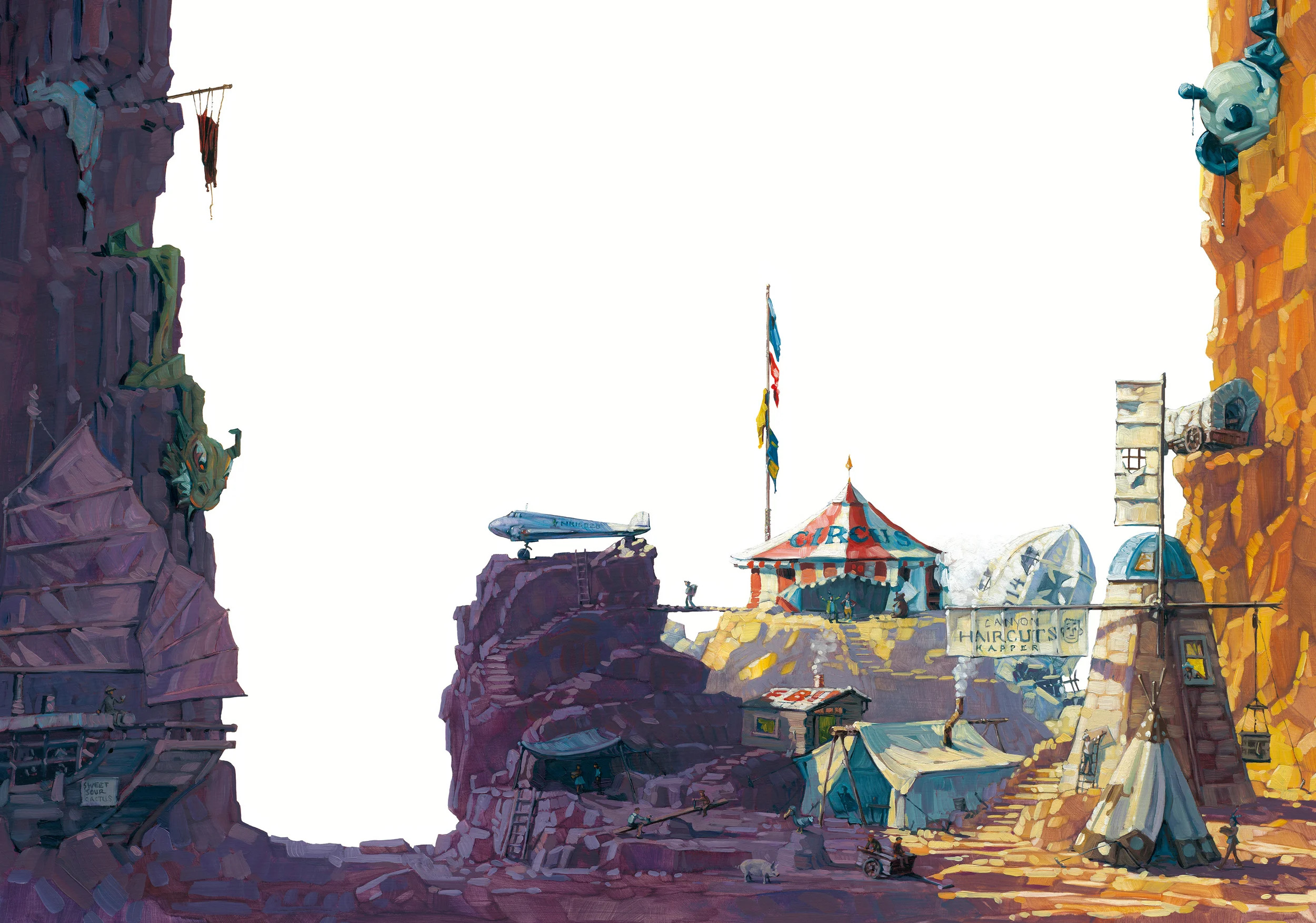 The Aviator's Camp • Oil on illustration board. This illustration was a real blast. I got to fill the camp with the tattered remains of every conceivable object that could fly or be swept away by a great wind.
