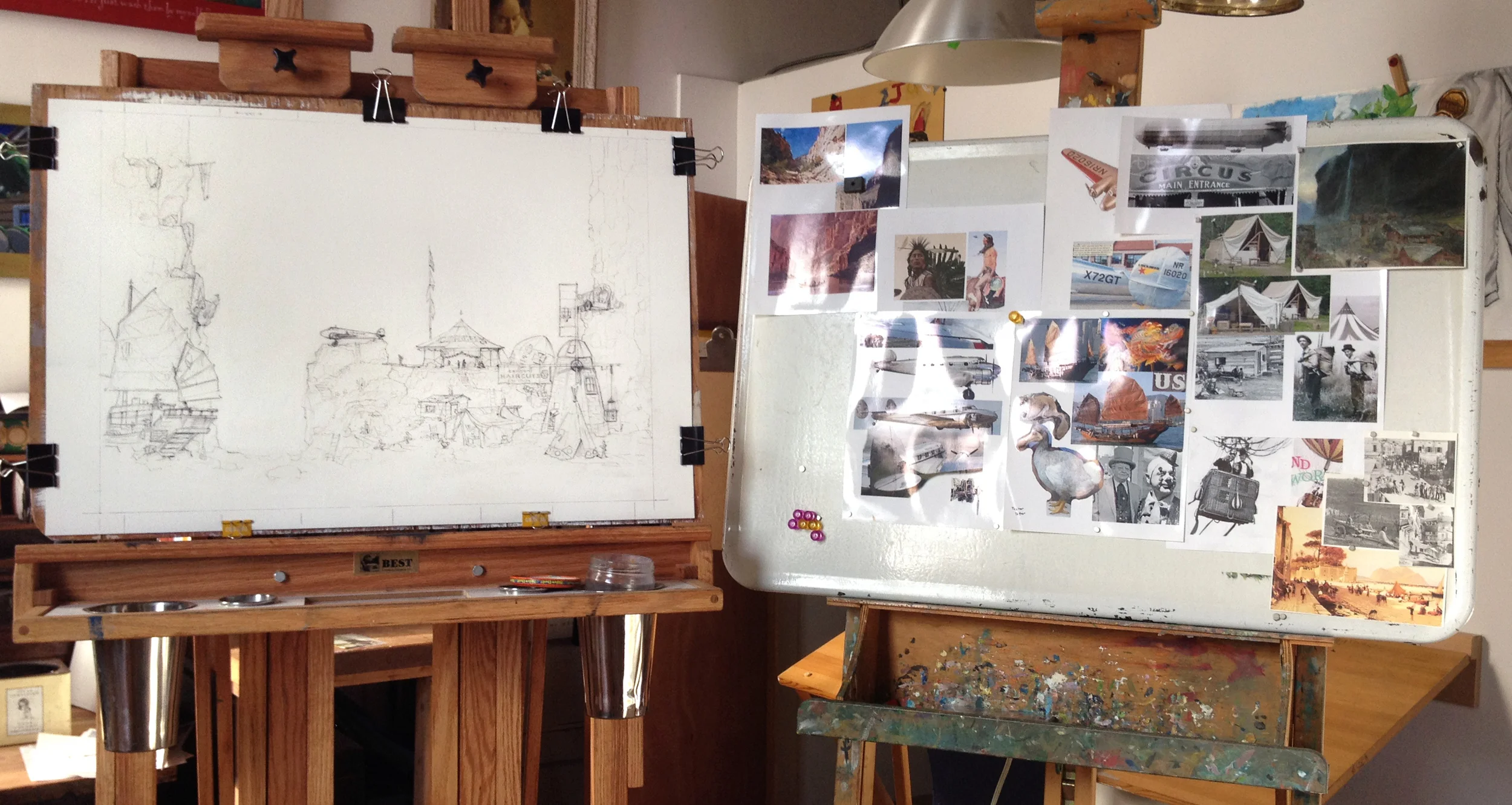 Working on The Aviator's Camp. One easel held the painting (here shown only sketched onto the illustration board) and one easel to hold all my reference photos.