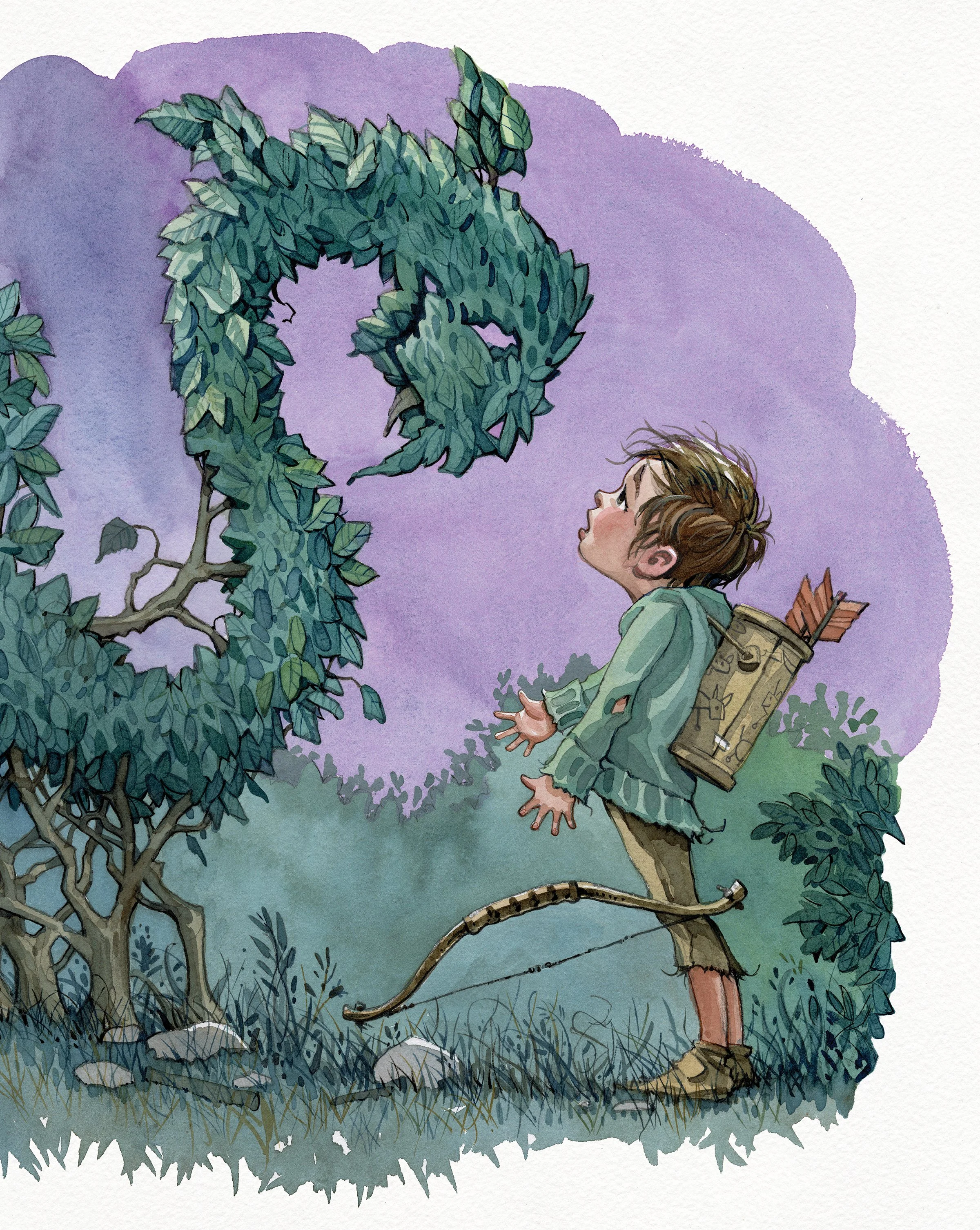 Run! • Watercolor and pencil. One reviewer has guessed what the quiver was made from—a cardboard container of oats.